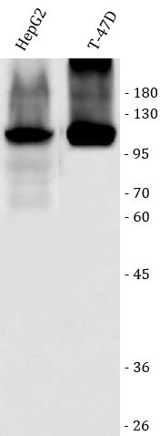 Western blot: HepG2 and T-47D stained with ARG45248 anti-EPLIN antibody at 0.5 μg/ml dilution.