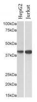 Western blot: 35 µg of HepG2 and Jurkat cell lysates (in RIPA buffer) stained with ARG42139 anti-EXOG / ENDOGL1 antibody at 0.2 µg/ml dilution and incubated at RT for 1 hour.