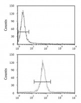 Flow Cytometry: HeLa cells stained with ARG43194 anti-Eg 5 antibody (bottom histogram) or without primary antibody as control (top histogram), followed by incubation with FITC labelled secondary antibody.