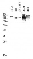 Western blot: HeLa, KB, SH-SY5Y, 293T and 3T3 cell lysates stained with ARG66667 anti-Eg 5 phospho (Thr926) antibody at 1:2000 dilution.