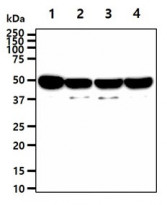 Western blot: 40 µg of 1) PC3, 2) MCF7, 3) 293T, and 4) HeLa cell lysates stained with ARG57167 anti-Enolase 1/2 antibody [1G7] at 1:1000.