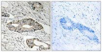 Immunohistochemistry: Paraffin-embedded Human colon carcinoma tissue stained with ARG66791 anti-Epsin 3 antibody. The picture on the right is blocked with the synthetic peptide.