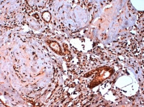 Immunohistochemistry: Formalin fixed, Paraffin-embedded Human breast cancer biopsy stained with ARG23195 anti-Estrogen Receptor beta b (beta 5 isoform) antibody [5/25]. Antigen Retrieval: Boil tissue section in Citrate buffer (pH 6.2). (low power).