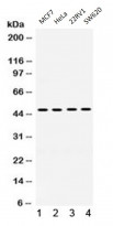 Western blot: MCF7, HeLa, 22RV1 and SW620 cell lysates stained with ARG58136 anti-F2R / PAR1 antibody.