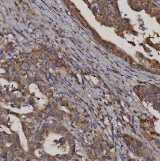 Immunohistochemistry: Human colorectal adenocarcinoma stained with ARG45274 anti-FATP3 antibody at 2 μg/ml dilution.