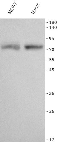Western blot: MCF-7 and Hacat stained with ARG45274 anti-FATP3 antibody at 0.5 μg/ml dilution.