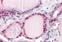 Immunohistochemistry: Paraffin-embedded Human thyroid tissue. Antigen Retrieval: Steam tissue section in Citrate buffer (pH 6.0). The tissue section was stained with ARG64064 anti-FBXL3 antibody at 5 µg/ml dilution followed by AP-staining.