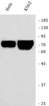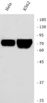Western blot: Hela and K562 stained with ARG45246 anti-FIP1L1 antibody at 0.5 μg/ml dilution.