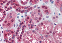 Immunohistochemistry: Paraffin-embedded Human kidney tissue. Antigen Retrieval: Steam tissue section in Citrate buffer (pH 6.0). The tissue section was stained with ARG64827 anti-FKBP4 / FKBP52 antibody at 3.75 µg/ml dilution followed by AP-staining.