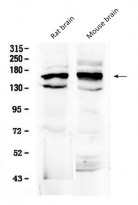 Western blot: 50 µg of samples under reducing conditions. Rat brain and Mouse brain lysates stained with ARG59438 anti-FMN1 antibody at 0.5 µg/ml, overnight at 4°C.