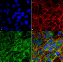Immunofluorescence: 4% Formaldehyde fixed (15 min, RT) C2C12 cells stained with ARG22626 anti-FNIP1 antibody at 1:100 for 60 min at RT. Secondary Antibody: Goat anti-Rabbit (ATTO 488) at 1:200 for 60 min at RT. Counterstain: Phalloidin Texas Red F-Actin stain; DAPI (blue) nuclear stain.