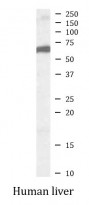 Western blot: 35 µg of Human liver lysate (in RIPA buffer) stained with ARG63339 anti-FOXA2 / HNF3B antibody at 1 µg/ml dilution and incubated at RT for 1 hour.
