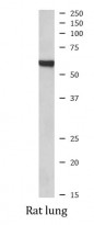 Western blot: 35 µg of Rat lung lysate (in RIPA buffer) stained with ARG63339 anti-FOXA2 / HNF3B antibody at 1 µg/ml dilution and incubated at RT for 1 hour.