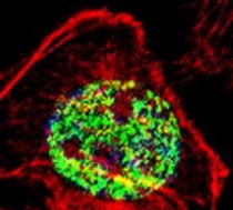 Immunofluorescence: A549 cells were fixed with 4% PFA (20 min), permeabilized with Triton X-100 (0.1%, 10 min), then stained with ARG40713 anti-FOXG1 antibody (green) at 1:25, 1 hour at 37°C. Cytoplasmic actin was counterstained with Alexa Fluor® 555 conjugated Phalloidin (red). Nuclei were counterstained with DAPI (blue).