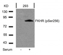 Western blot: Extracts from 293 cells untreated or treated with serum stained with ARG51617 anti-FOXO1 / FKHR phospho (Ser256) antibody.