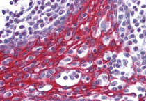 Immunohistochemistry: Paraffin-embedded Human tonsil tissue. Antigen Retrieval: Steam tissue section in Citrate buffer (pH 6.0). The tissue section was stained with ARG63569 anti-FOXO3A antibody at 2.5 µg/ml dilution followed by AP-staining.