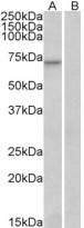 Western blot: 35 µg of Human heart lysate (in RIPA buffer) with (B) and without (A) blocking peptide. The blots were stained with ARG63569 anti-FOXO3A antibody at 0.3 µg/ml dilution and incubated at RT for 1 hour.