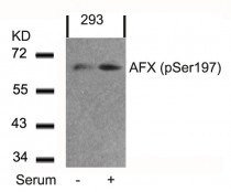 Western blot: Extracts from 293 cells untreated or treated with serum stained with ARG51637 anti-FOXO4 phospho (Ser197) antibody.