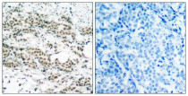 Immunohistochemistry: Paraffin-embedded Human breast carcinoma tissue stained with ARG51637 anti-FOXO4 phospho (Ser197) antibody (left) or the same antibody preincubated with blocking peptide (right).