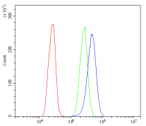 Flow Cytometry: A431 cells were blocked with 10% normal goat serum and then stained with ARG43138 anti-FRMD6 / Willin antibody (blue) at 1 µg/10^6 cells for 30 min at 20°C, followed by incubation with DyLight®488 labelled secondary antibody. Isotype control antibody (green) was rabbit IgG (1 µg/10^6 cells) used under the same conditions. Unlabelled sample (red) was also used as a control.