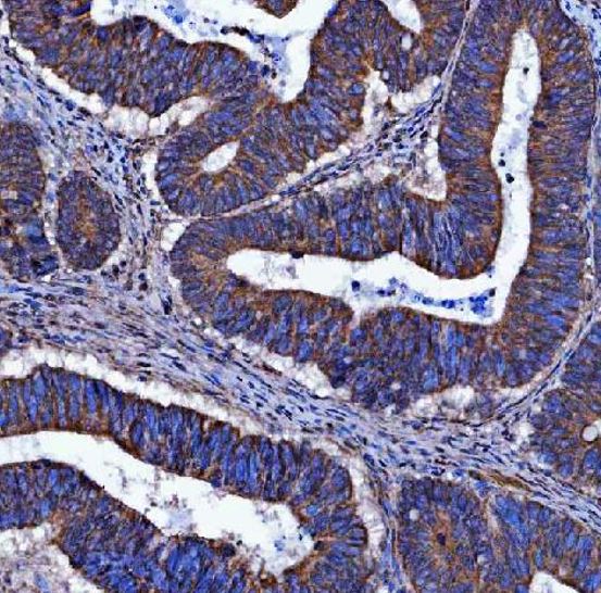 Immunohistochemistry: Human colorectal adenocarcinoma stained with ARG45522 anti-FRY antibody at 2 μg/ml dilution.