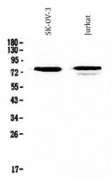 Western blot: 50 ug of samples under reducing conditions. SK-OV-3 and Jurkat cell lysates stained with ARG40599 anti-FZD3 / Frizzled 3 antibody at 0.5 ug/ml, overnight at 4°C.