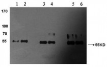 Western Blot: 1,2: Anti-human Factor-X ab used at 0.2 μg/mL dilution 3,4: Anti-human Factor-X ab used at 0.5 μg/mL dilution 5,6: Anti-human Factor-X ab used at 1 μg/mL dilution stained with anti-Factor X antibody [F10-1] (ARG10090)
