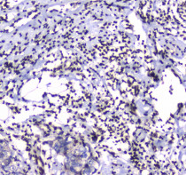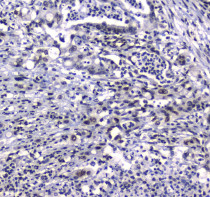 Immunohistochemistry: Paraffin-embedded Human rectal cancer tissue. Antigen Retrieval: Heat mediated was performed in Citrate buffer (pH 6.0, epitope retrieval solution) for 20 min. The tissue section was blocked with 10% goat serum. The tissue section was then stained with ARG58782 anti-GFI1 antibody at 1 µg/ml, overnight at 4°C.