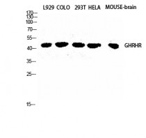 Western blot: Mouse lung, brain, spleen, kidney, heart, 293T, HeLa, MCF-7, 3T3, KB, U2OS, U2OS UV, HeLa UV and A549 lysates stained with ARG66399 anti-GHRH Receptor antibody at 1:2000 dilution.