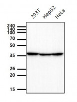 Western blot: 40 µg of 293T, HepG2 and HeLa cell lysates stained with ARG57115 anti-GIPC antibody [1G10] at 1:1000 dilution.