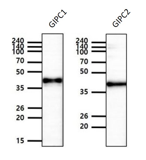 Western blot: 50 ng of GIPC1 and GIPC2 recombinant protein stained with ARG57115 anti-GIPC antibody [1G10] at 1:1000 dilution.