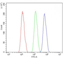 Flow Cytometry: A431 cells were blocked with goat sera and stained with ARG10606 anti-GNAQ antibody at 1 µg/10^6 cells (blue); Cells alone (red); Isotype control (green).