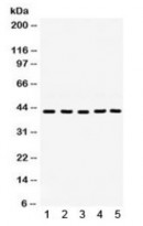 Western blot: 1) Rat ovary, 2) Rat testis, 3) Mouse testis, 4) Human 22RV1 and 5) Human SKOV lysate stained with ARG10606 anti-GNAQ antibody.