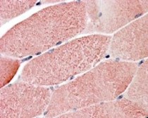 Immunohistochemistry: paraffin embedded Human Skeletal Muscle. (Steamed antigen retrieval with citrate buffer pH 6) stained with ARG63325 anti-GNIP / TRIM7 antibody at 3.8 µg/ml dilution followed by AP-staining.