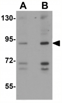 Western blot: Rat brain tissue lysate stained with ARG56850 anti-GPAT1 antibody at (A) 1 and (B) 2 µg/ml dilution.