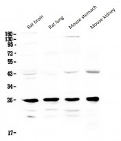 Western blot: 50 µg of samples under reducing conditions. Rat brain, Rat lung, Mouse stomach and Mouse kidney lysates stained with ARG58780 anti-GSTM1 antibody at 0.5 µg/ml, overnight at 4°C.