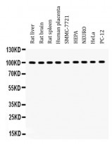 Western blot: 50 µg of Rat liver, 50 µg of Rat brain, 50 µg of Rat spleen, 50 µg of Human placenta, 40 µg of SMMC-7721, 40 µg of HEPA, 40 µg of NEURO, 40 µg of HeLa and 40 µg of PC-12 whole cell lysates stained with ARG40891 anti-Glucocorticoid Receptor antibody at 0.5 µg/ml dilution.