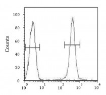 Flow Cytometry: Ramos cells stained with ARG55368 anti-Glucose 6 phosphate isomerase antibody (right histogram) or without primary antibody control (left histogram), followed by incubation with FITC labelled secondary antibody.