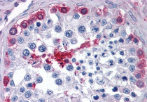Immunohistochemistry: Paraffin-embedded Human testis tissue. Antigen Retrieval: Steam tissue section in Citrate buffer (pH 6.0). The tissue section was stained with ARG65103 anti-Glucose 6 phosphate isomerase antibody at 3.75 µg/ml dilution followed by AP-staining.