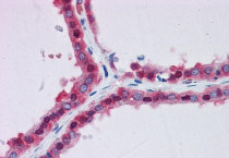 Immunohistochemistry: Paraffin-embedded Human thyroid tissue. Antigen Retrieval: Steam tissue section in Citrate buffer (pH 6.0). The tissue section was stained with ARG65103 anti-Glucose 6 phosphate isomerase antibody at 3.75 µg/ml dilution followed by AP-staining.