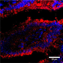 Immunohistochemistry: Thin section of Mouse small intestine stained with ARG10785 anti-Guanylate Cyclase C antibody (red). Blue: Nuclei.