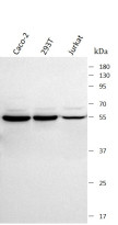 Western blot: Caco-2, 293T and Jurkat stained with ARG44500 anti-HDHD5 antibody at 0.5 μg/mL dilution.