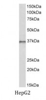 Western blot: 35 µg of HepG2 cell lysate (in RIPA buffer) stained with ARG42185 anti-HOXC10 antibody at 1 µg/ml dilution and incubated at RT for 1 hour.