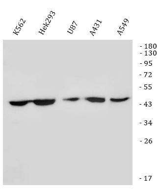 Western blot: K562, Hek293, U87, A431,and A549 stained with ARG45184 anti-HOXD11 antibody at 0.5 μg/ml dilution.