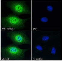 Immunofluorescence: Paraformaldehyde fixed HEK293 cells permeabilized with 0.15% Triton. Cells were stained with ARG65207 anti-HOXD13 antibody (green) at 10 µg/ml dilution for 1 hour. DAPI (blue) for nuclear staining. Negative control: Unimmunized goat IgG (green) at 10 µg/ml dilution.
