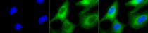 Immunofluorescence: Heat Shocked (42°C for 1 hour) HeLa cells. Fixation: 2% Formaldehyde for 20 min at RT. Primary antibody: ARG20504 anti-Hsp 90 antibody at 1:100 for 12 hours at 4°C. Secondary antibody: FITC Goat anti-Rabbit (green) at 1:200 for 2 hours at RT. Counterstain: DAPI (blue) nuclear stain at 1:40000 for 2 hours at RT. Magnification: 100x. Left: DAPI (blue) nuclear stain. Middle: Primary antibody. Right: Composite.