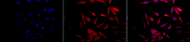 Immunofluorescence: Heat Shocked (42°C for 1 hour) HeLa cells. Fixation: 2% Formaldehyde for 20 min at RT. Primary antibody: ARG20504 anti-Hsp 90 antibody at 1:100 for 12 hours at 4°C. Secondary antibody: APC Goat anti-Rabbit (red) at 1:200 for 2 hours at RT. Counterstain: DAPI (blue) nuclear stain at 1:40000 for 2 hours at RT. Magnification: 20x. Left: DAPI (blue) nuclear stain. Middle: Primary antibody. Right: Composite.