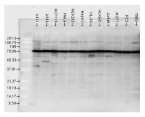 Western blot: A431, A549, HCT116, HeLa, HEK293, HepG2, HL-60, HUVEC, Jurkat, MCF7, PC3, and T98G cell lysates stained with ARG20504 anti-Hsp 90 antibody.