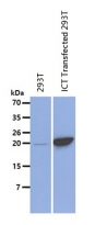 Western blot: 5 µg of 1) 293T, and 2) ICT Transfected 293T cell lysate stained with ARG57122 anti-ICT1 antibody [1E9] at 1:1000.