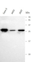 Western blot: Caco-2, A431 and 293T stained with ARG44437 anti-IDI1 antibody at 0.5 μg/mL dilution.